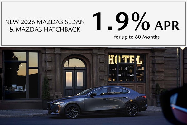 1.9% APR for 60 months. $17.48 per month per $1,000 borrowed. With approved credit through Mazda Financial Services. Very well-qualified buyers only. Not all will qualify. $0 Down; with approved credit. On select 2026 Mazda3 Sedan and Mazda3 Hatchback models. Advertised Price EXCLUDES all optional dealer offered items, accessories, or product addendums optionally selected by the purchaser, applicable official taxes and fees, and a $699 SC Dealer Closing Fee. See dealer for details. Offer Expires 03/02/2026.