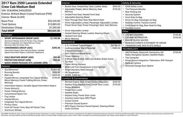 Leather, Heated Seats, Cooled Seats, Navigation (NAVI/GPS), Sunroof / Moonroof, Clean CARFAX, 1 OWNER, Local Trade, Auto High Beam Headlamp Control, Bi-Function Black Projector Headlamp, Black Painted Exterior Mirrors, Black Power Fold-Away Mirrors, Black Premium Tail Lamp, Black RAM Head Tailgate Badge, Black Wheel Center Hub, Body Color Door Handles, Body Color Grille w/Black Wave Insert, Cold Weather Group, Convenience Group, Engine Block Heater, Flat Black 4x4 Badge, Flat Black RAM 2500 Badge, Front Armrest w/Cupholders, Painted Front Bumper, Painted Rear Bumper, Protection Group, Quick Order Package 2FH Laramie, Rain Sensitive Windshield Wipers, Sport Appearance Group, Wheels: 20 x 8.0 Black Painted Aluminum, Winter Front Grille Cover.