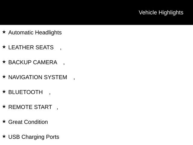 Automatic Headlights, LEATHER SEATS ,, BACKUP CAMERA ,, NAVIGATION SYSTEM ,, Bluetooth® ,, REMOTE START ,, Great Condition, USB Charging Ports, Automactic Transmission, SUPER CLEAN, GET QUOTE ONLINE TODAY, PRICED TO MARKET, LOCAL TRADE.