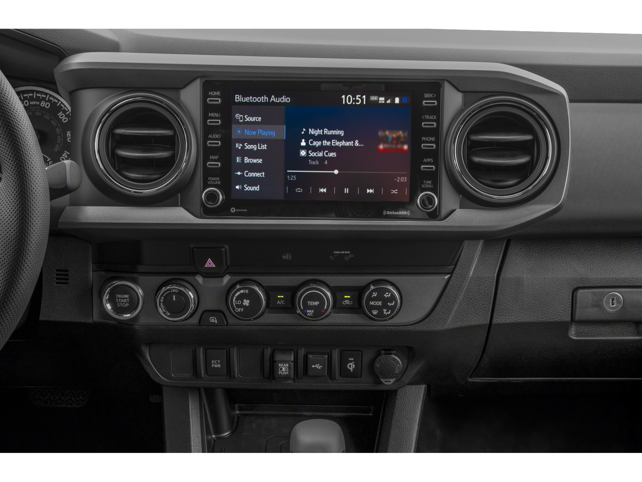 4WD, 120V/400W Deck Mounted AC Power, 6 Speakers, ABS brakes, Air Conditioning, Alloy wheels, AM/FM radio: SiriusXM, Anti-whiplash front head restraints, Apple CarPlay/Android Auto, Auto High-beam Headlights, Auto-dimming Rear-View mirror, Auto-Dimming Rearview Mirror w/HomeLink, Automatic temperature control, Black Overfenders, Brake assist, Bumpers: body-color, Driver door bin, Dual front impact airbags, Dual front side impact airbags, Electronic Stability Control, Emergency communication system: Safety Connect with 1-year trial, Engine Immobilizer, Exterior Parking Camera Rear, Fabric Seat Trim (FD), Front anti-roll bar, Front Bucket Seats, Front Center Armrest, Front dual zone A/C, Front fog lights, Front reading lights, Front Seats, Front wheel independent suspension, Garage door transmitter: HomeLink, Heated door mirrors, Illuminated entry, Knee airbag, Leather Shift Knob, Low tire pressure warning, Occupant sensing airbag, Outside temperature display, Overhead airbag, Overhead console, Panic alarm, Passenger door bin, Power door mirrors, Power driver seat, Power Sliding Rear Window w/Privacy Glass, Power steering, Power windows, Radio: AM/FM Radio, Rear step bumper, Remote keyless entry, Security system, Speed control, Speed-sensing steering, Split folding rear seat, Steering wheel mounted audio controls, Tachometer, Telescoping steering wheel, Tilt steering wheel, Traction control, Trip computer, Turn signal indicator mirrors, Variably intermittent wipers, and Wheels: 16 x 7J Machined Contrast Alloy.